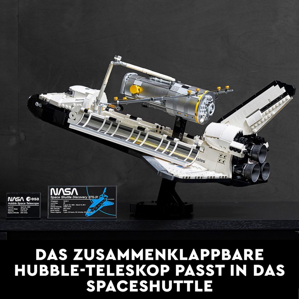 Das NASA-Spaceshuttle „Discovery“ ist wohl das berühmteste Raumfahrzeug der letzten 40 Jahre. Die Raumfähre hat mehr als 238 Millionen Kilometer zurückgelegt, dabei die Geheimnisse unseres Sonnensystems gelüftet und unser Verständnis des Universums erweitert. Baue diese unfassbare detailreiche LEGO® Version des legendären Spaceshuttles inklusive Hubble-Weltraumteleskop nach, um die großartigen Errungenschaften der Weltraumforschung zu würdigen.