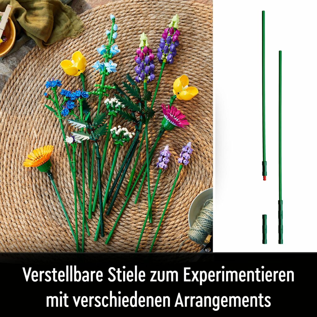 Belohne dich oder eine deiner Lieben mit dem LEGO® Icons Wildblumenstrauß, der niemals verwelkt. 8 Wildblumenarten bilden einen farbenprächtigen Blumenstrauß, der aus raffiniert zusammengefügten LEGO Steinen besteht. Die Blumen verfügen über verstellbare Stängel, damit du deinen ganz individuellen und besonders kreativen Blumenstrauß erschaffen kannst, der alle Blicke auf sich zieht.