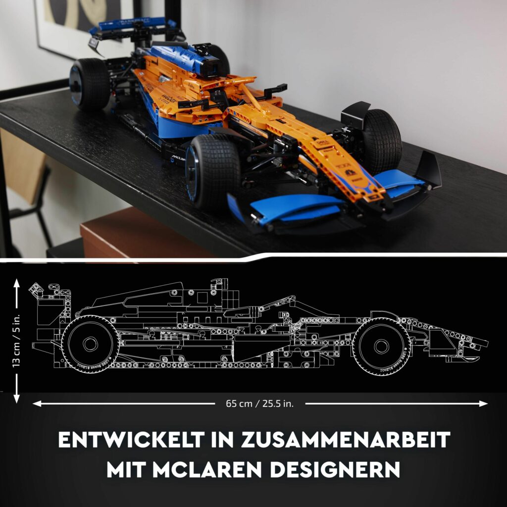 Das LEGO® Technic Set „McLaren Formel 1™ Rennwagen“ für Erwachsene lässt dich deine Motorsportbegeisterung ausleben. Die Präsentation eines neuen Formel 1-Rennwagens ist immer ein großes Spektakel. Für das Jahr 2022 haben die LEGO Designer eng mit McLaren Racing zusammengearbeitet, denn die Experten aus beiden Teams mussten ihre Modelle gleichzeitig entwickeln. Jetzt darfst du dieses imposante Modell mit all seinen Details zusammensetzen.