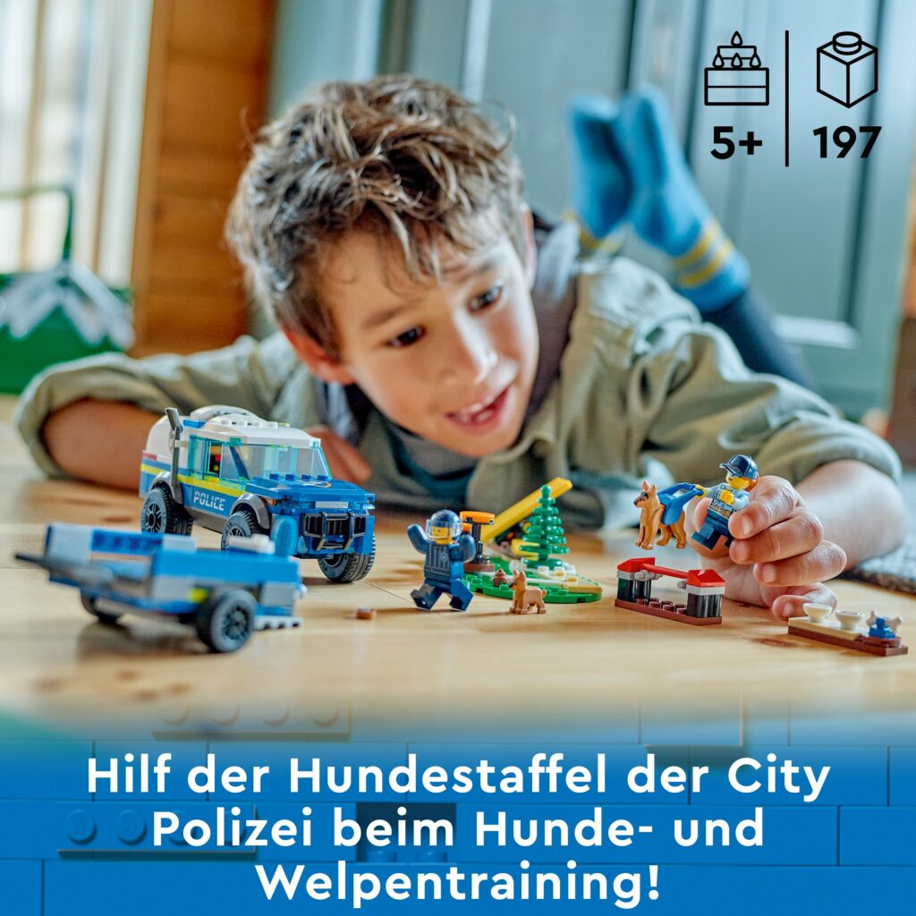 Wuff, wuff! Hilf der Hundestaffel der LEGO® City Polizei beim Hunde- und Welpentraining. Lade die Ausrüstung auf den Anhänger. Und vergiss bloß nicht die Fressnäpfe! Hilf dem Polizeihund und dem Welpen ins SUV der Hundestaffel und fahr zum Trainingsplatz. Bau dann gleich die Wippe, das Sprunghindernis und die Trittpfoten auf und bereite alles für einen spannenden Trainingstag vor.