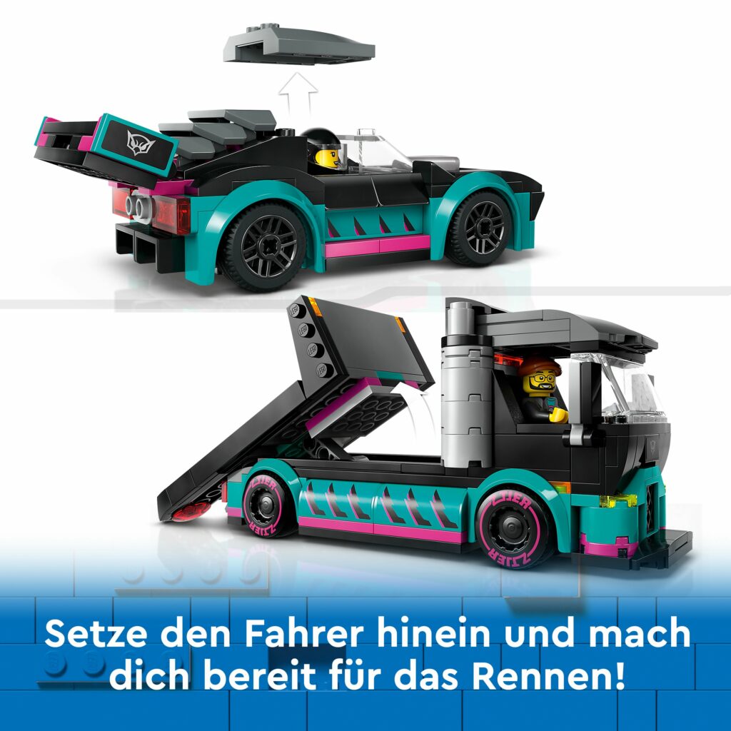 Heute ist das große Rennen. Der Autotransporter mit Rennwagen kann gleich losfahren. Schau dir das ebenso windschnittige wie „bullige“ Design, das tiefergelegte Fahrwerk und die breit ausgestellten Radkästen des rasanten Rennautos an. Das alles verspricht maximalen Grip und bestes Handling. Fahr die Laderampe aus, roll auf den Autotransporter hinauf und begib dich zur nächsten Rennstrecke. Freu dich auf spannende Action mit dem Flitzer und dem LKW!
