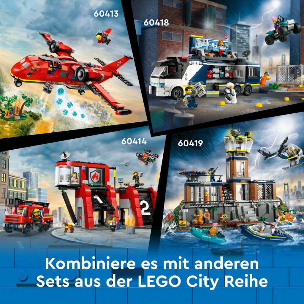In einem entlegenen Waldgebiet wütet ein heftiges Feuer! Hier kann nur das gigantische LEGO® City Löschflugzeug helfen. Lade die Abwurftanks ein und flieg los, um den Waldbrand aus der Luft zu bekämpfen. Flieg ganz niedrig über die Baumwipfel, um gewaltige Wassermengen abzuwerfen. Setz dann die starken Feuerlöscher ein und schick den futuristischen Raketenrucksack-Feuerwehrmann los, um die restlichen Flammen zu löschen und die Lage zu retten. Viel Glück!