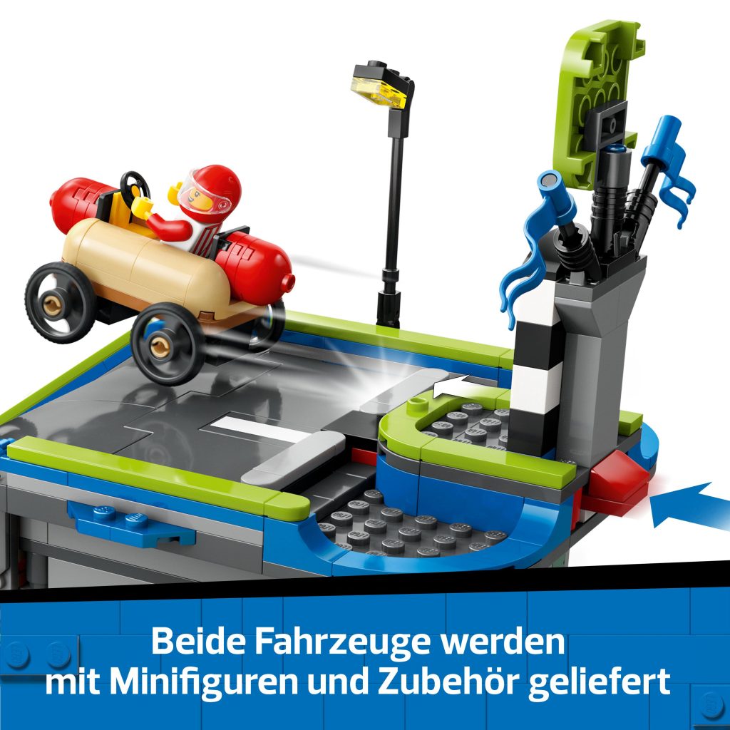 LEGO® City Keine Limits: Seifenkistenrennen mit Rampe lässt dich rasante Seifenkistenrennen austragen! Auf den Straßen von LEGO City finden jetzt tolle Rennen statt. Alle sind schon ganz aufgeregt. Stell die Hotdog-Seifenkiste und die Toilette oben auf die Rampe, drück den Hebel und lass die beiden losflitzen. Wird der Klempner oder der Hotdogverkäufer gewinnen? Freu dich auf riesigen Actionspaß!