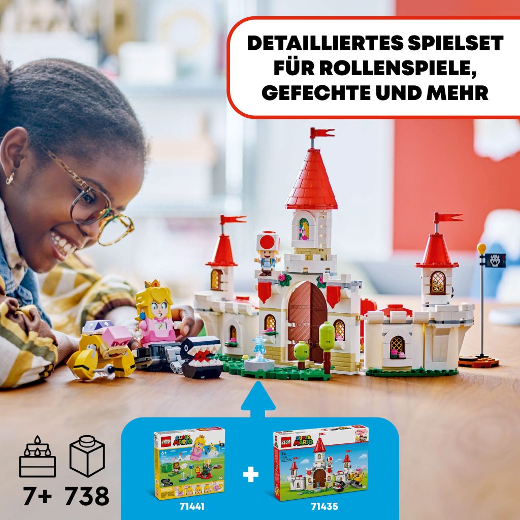 Öffne die Tür zum prächtigen Pilz-Palast! Setz dich auf den Thron oder ans Klavier. Triff dich im Garten mit dem Toad. Feure mit dem Katapult, um Roys Angriffe mit dem Kettenhund abzuwehren! Verbünde dich mit LEGO® Mario™, LEGO Luigi™ oder LEGO Peach™ (Figur nicht enthalten), um den Kettenhund zu bändigen. Such nach dem Münzblock und dem Superstern-Block und sammle möglichst viele Münzen!