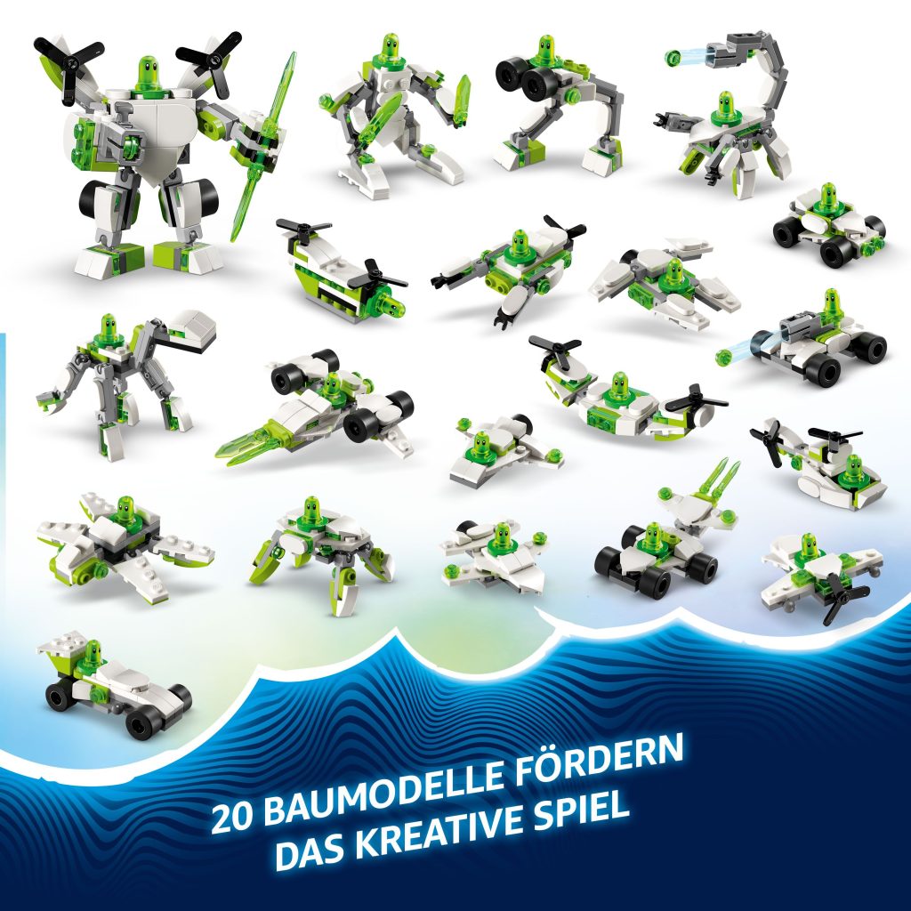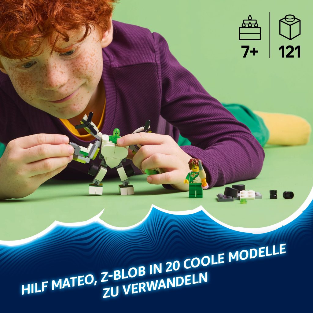 Bist du bereit, deine kreative Seite voll auszuleben und Mateo zu helfen, Z-Blob in 20 coole Modelle von Robotern, Fahrzeugen und Mechs zu verwandeln? Dann freu dich auf jede Menge Bauspaß in der Traumwelt. LEGO® DREAMZzz™ Z-Blob's Roboter- und Fahrzeugabenteuer ist ein Bauset, mit dem du Z-Blob in einen Roboter, einen Hubschrauber, einen Rennwagen, einen Turbojet oder einen Skorpion verwandelst.