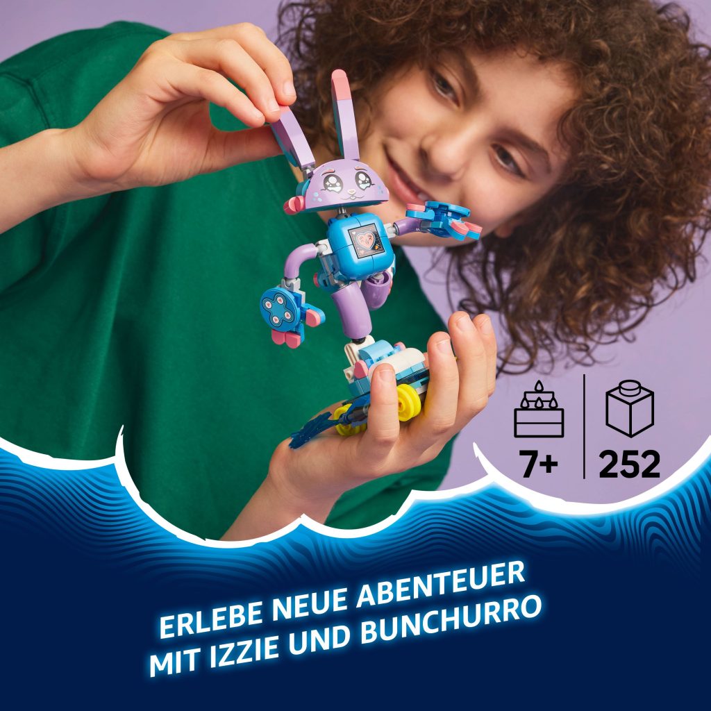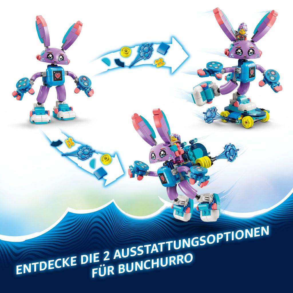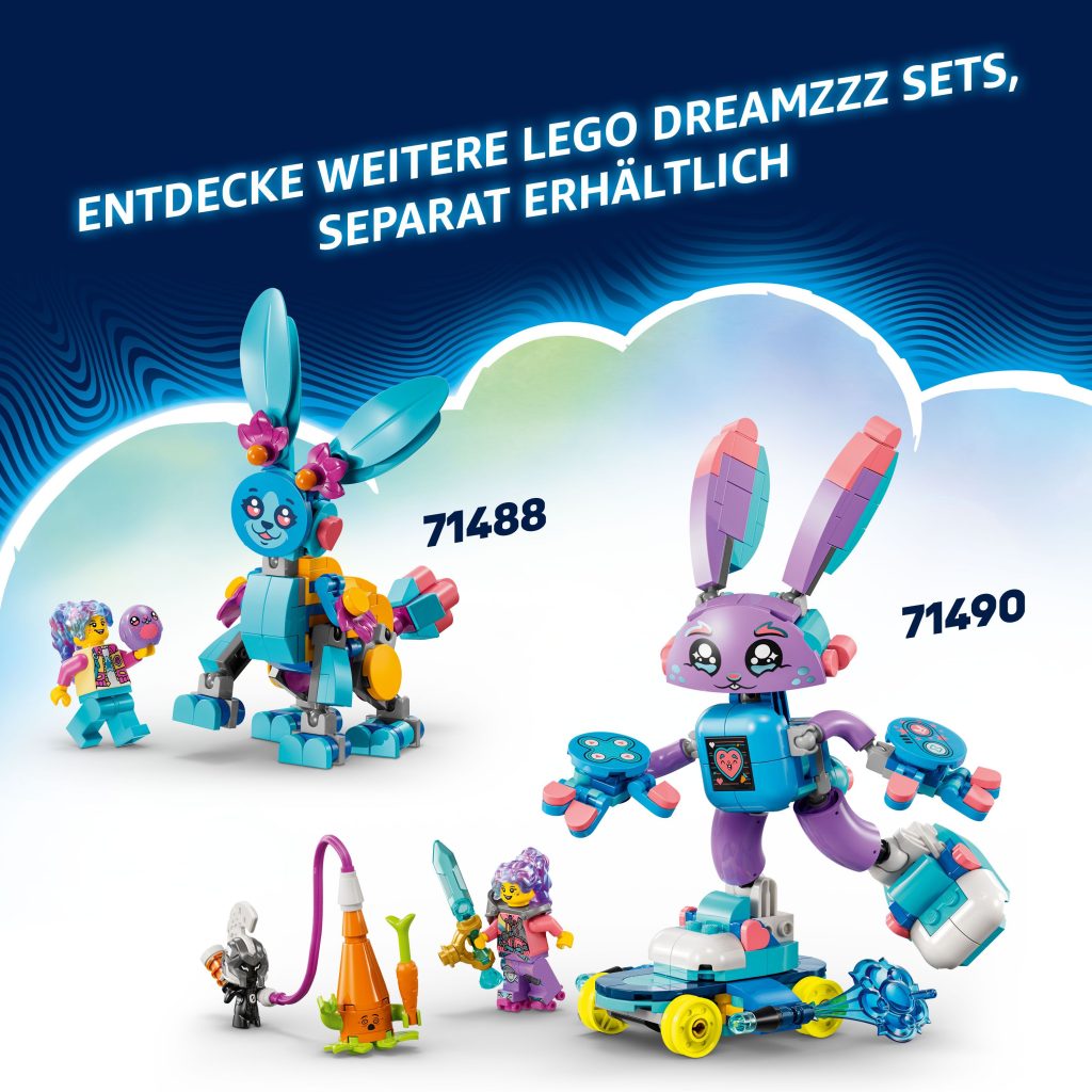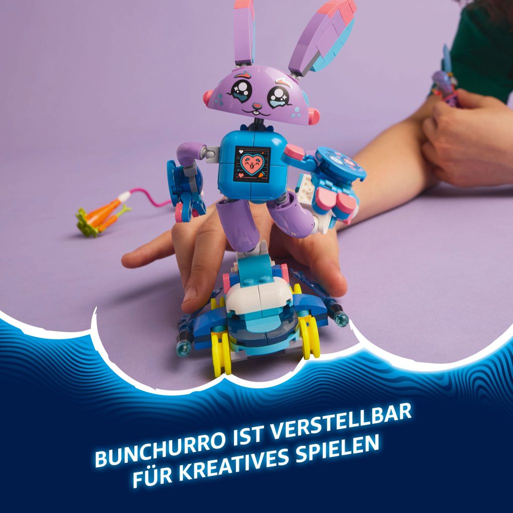 Dieses fantastische LEGO® DREAMZzz™ Bauset lässt dich mit Izzie und Bunchurro in neue Abenteuer hopsen. Ein Cyberling mit einem Entsafter saugt eine Träumlingmöhre leer, und Izzie braucht deine Hilfe, um sie zu retten! Baue die Figur Bunchurro und statte den coolen Hasen dann für rasante Abenteuer mit einem Skateboard samt Boostern oder mit einem Raketenrucksack aus. Los geht‘s!