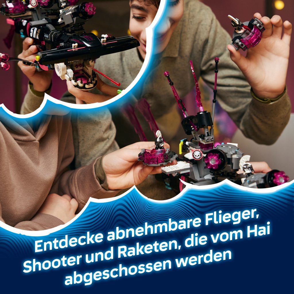 Dieses tolle LEGO® DREAMZzz™ Bauset bietet dir 2 coole Bauoptionen, um dich auf spannende Abenteuer in die Traumwelt zu schicken. Du kannst einen Spielzeughai bauen und in ein Hai-U-Boot oder einen Hammerhai-Kreuzer verwandeln. Am fertigen Modell kannst du unter anderem abnehmbare Flieger, Shooter und Raketen entdecken, die aus dem Maul des Hais abgefeuert werden.