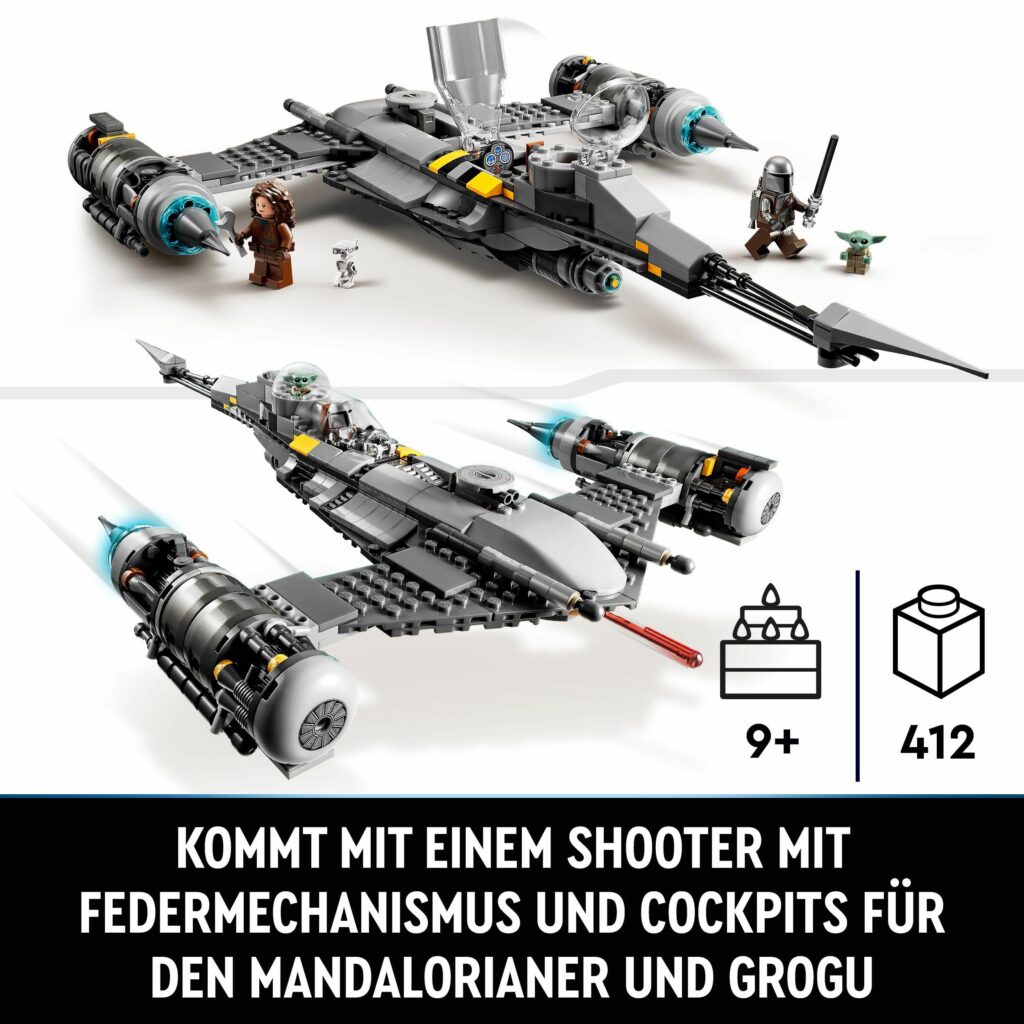 Stell deine eigenen spannenden Geschichten mit dem N-1 Starfighter des Mandalorianers aus Star Wars: Das Buch von Boba Fett dar. Dieses Modell aus LEGO Steinen ist genauso schrottreif wie das Original. Zum Glück ist Peli Motto mit ihrem BD-Droiden zur Stelle, um bei den Reparaturen zu helfen! Geh dann mit Grogu an Bord, um dich auf deine nächste Mission auf Tatooine zu begeben. Solltest du unterwegs irgendwelchen Feinden begegnen, kannst du den Torpedo abfeuern, um dich aus der Bedrängnis zu retten!