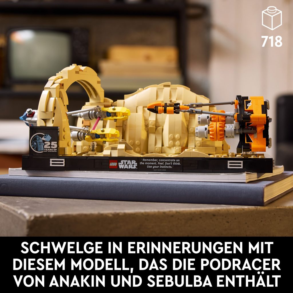 Baue mit diesem LEGO® Star Wars™ Diorama einen dynamischen Schnappschuss des Podrennens in Mos Espa. Stell die Szene dar, in der Anakin Skywalker seinen Rivalen Sebulba durch einen Felsbogen in der Schlucht verfolgt. Bring die Plakette mit Qui-Gon Jinns Ratschlag an: „Remember. Concentrate on the moment. Feel. Don't think. Trust your instincts.“ Ein Stein zur Feier des 25-jährigen LEGO Star Wars Jubiläums vollendet diesen nostalgischen Hingucker.