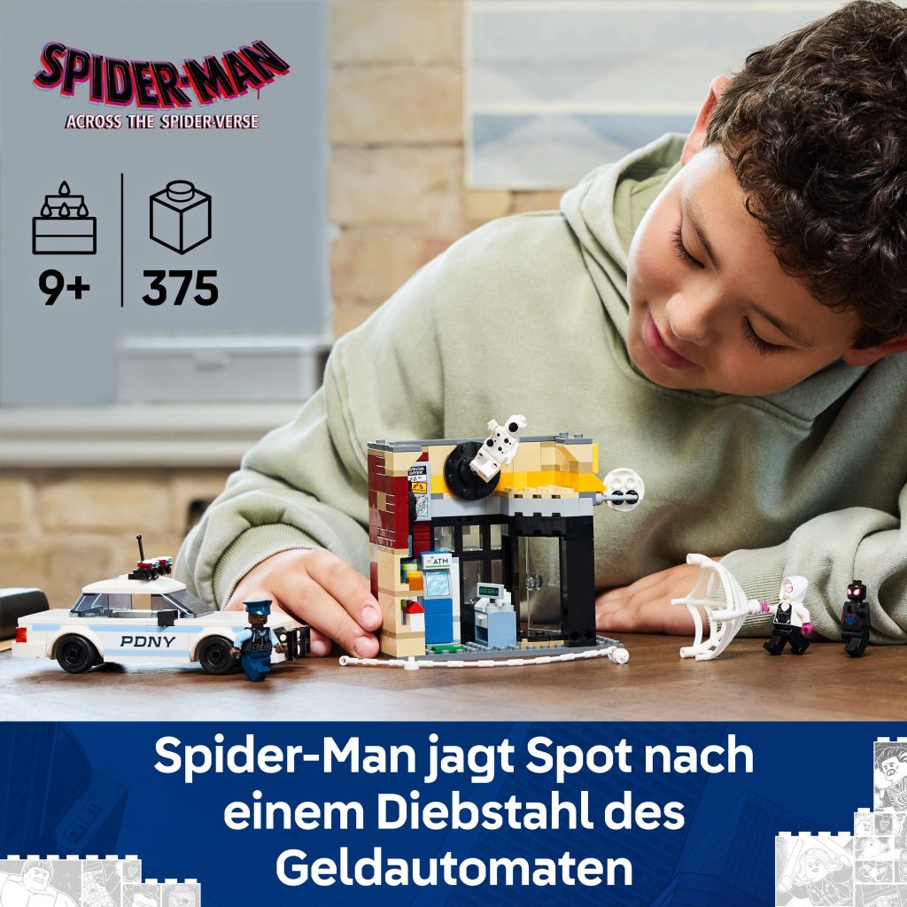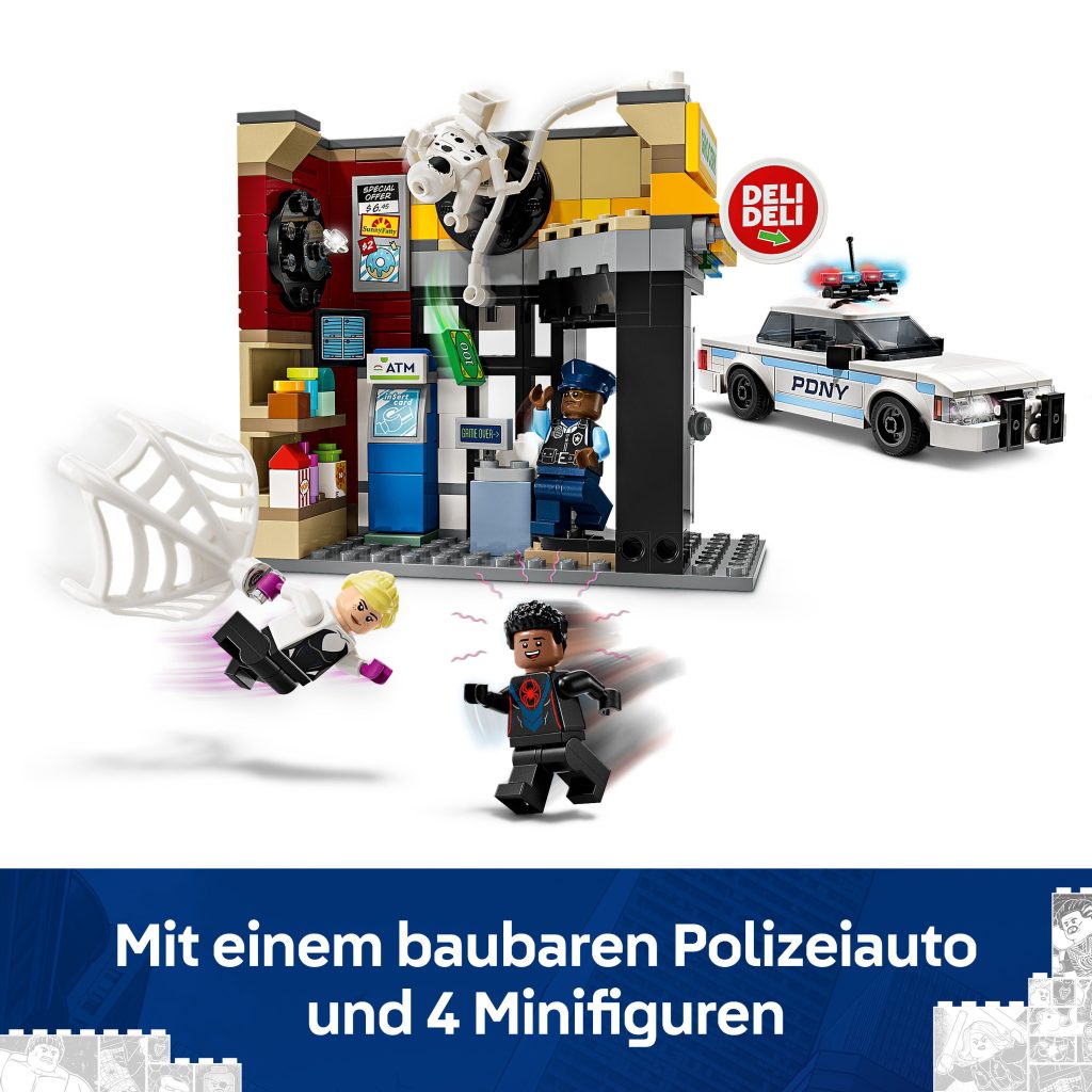 Spot dringt durch sein Portal in den Mini-Markt ein und sprengt eine Mauer auf, um sich den Geldautomaten unter den Nagel zu reißen. Miles Morales (mit seinem Netz), Gwen Stacy (mit ihrem Netzseil) und Officer Jefferson (in seinem Polizeiauto) eilen zum Tatort! Können die Helden Spot ergreifen, bevor er sich durch ein weiteres Portal aus dem Staub macht?